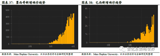 首先,越来越多的亚非拉新兴市场国家的新增确诊案例开始上升。截至4月18日;新兴市场国家墨西哥和巴西等,新增确诊趋势开始迅速上升,拐点仍未出现。其次,亚非拉新兴市场国家在检测方面的能力较为欠缺,可能存在大量未确诊案例。第三,新兴市场国家医疗资源相较于发达国家更为脆弱。根据柳叶刀杂志所载文章[1],2016年全球医疗可及性和质量指数地图显示,印度、孟加拉国、尼日利亚等所在的南亚、东南亚及非洲地区医疗可及性和质量指数较低。