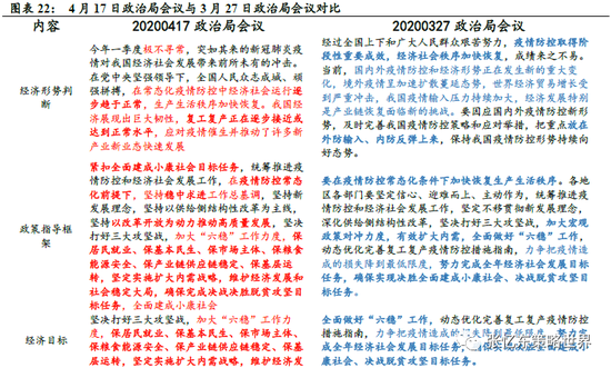 0417政治局会议对于经济形势的判断:“极不寻常”。相比3月27日对于经济形势判断的表示——经过全国上下和广大人民群众艰苦努力,疫情防控取得阶段性重要成效,经济社会秩序加快恢复,4月17日政治局会议对于经济形势判断的表述为:今年一季度极不寻常。