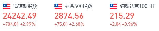 截至周五收盘,标普500指数涨75点,涨幅2.68%,报2874.56点;纳指涨117.8点,涨幅1.38%,报8650.14点;道指涨704.8点,涨幅2.99%,报24242.49点。本周道指、标普500和纳指分别累计涨2.21%、3.04%和6.09%,均连续两周上涨。