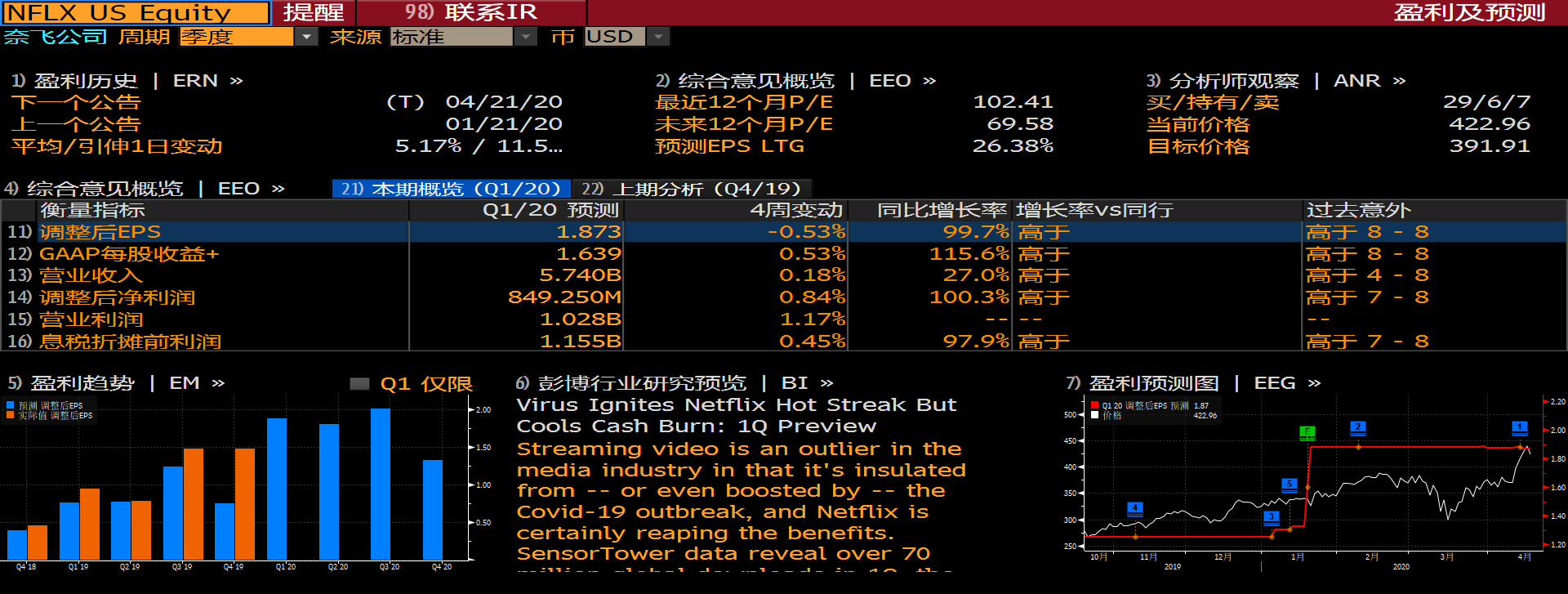 全球流媒体巨头奈飞(Netflix)将于4月21日(周二)公布2020年Q1财报。根据彭博分析师预期,2020年Q1奈飞营收为57.4亿美元,同比增长0.18%;调整后净利润为8.49亿美元,调整后每股收益为1.873美元。