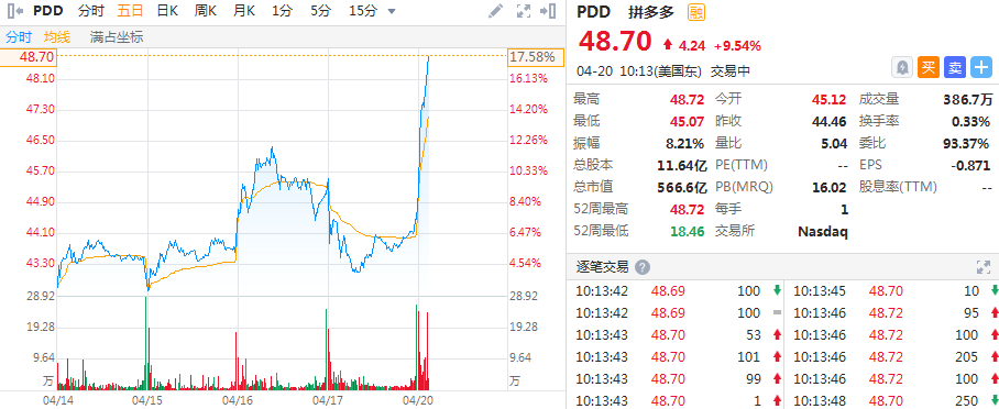 周一美股开盘,拼多多(PDD.US)股价一路向上,触及历史新高47.88美元。截至21:40,该股涨9.54%,报48.7美元,总市值566.6亿。最新涨幅扩大至11%.