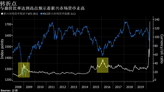 MSCI新兴市场货币指数在经历了11年来最严重的季度下跌之后,其相对于最近月的西德克萨斯中质油(WTI)合约升至纪录高点。该合约周一跌破每桶15美元,创下21年低点。以往只要该比率出现这种飙升,新兴市场货币就会在随后的12个月内上涨。