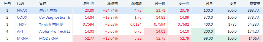 疫苗概念股诺瓦瓦克斯涨超24%,口罩概念股Alpha Pro Tech Ltd涨超5%,Tonix Pharmaceuticals Holding Corp涨2.62%,Co-Diagnostics涨超13%。