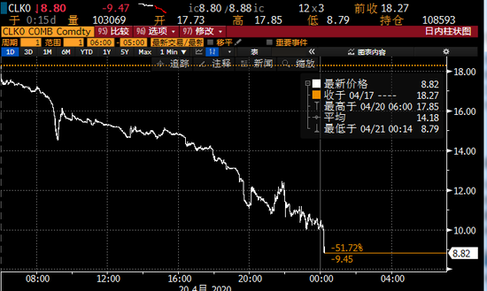 美东时间12点12分左右,WTI 5月份原油期货合约日内跌超51.72%,下跌超过9.45美元至每桶8.82美元。12点31分,该合约价格跌破8美元,跌幅超过56%。