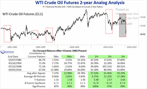 当WTI期货遭遇类似的大幅抛售之后市场一般会如何变动?以1986/1994/1998/2016年的四次抛售为例,平均在一个月后油价会反弹7.37%,3个月后会反弹13.98%,一年后会反弹37.54%。