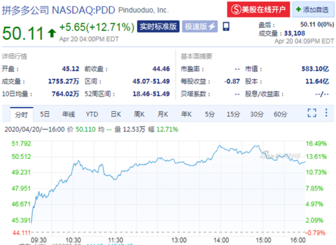 新浪科技讯 北京时间4月21日凌晨消息,周一开盘后,拼多多(NASDAQ:PDD)股价一路上涨,一度涨近15%,市值逼近600亿美元。截止收盘,拼多多 股价大涨12.71%,报50.11美元,市值583.1亿美元,创历史新高。