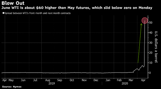 这两份合约相差近60美元,表明人们日益担心因炼油厂减产,近期需要做原油实物交割的人可能找不到处置这些原油的地方。新冠防疫措施导致的需求匮乏,已经让美国石油存储设备达到极限。