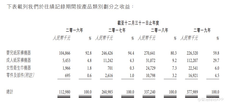 其中的原因与支柱业务婴儿纸尿裤机器下滑有关。2017年婴儿纸尿裤机器业务收入同比增加135%,带动整体收入翻倍增长,但2018年该业务增速降至9.8%,2019年同比倒跌16.38%。