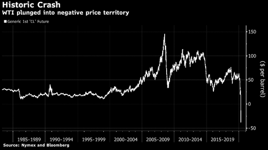 几十年来,WTI期货一直是美国石油行业的标杆,亲历过繁荣、萧条、战争、危机等各种阳光风雨,但是过往的任何一次经历皆无法与此次同日而语。一天交易结束后,期货合约的价格从每桶17.85美元直线下跌到了-37.63美元。