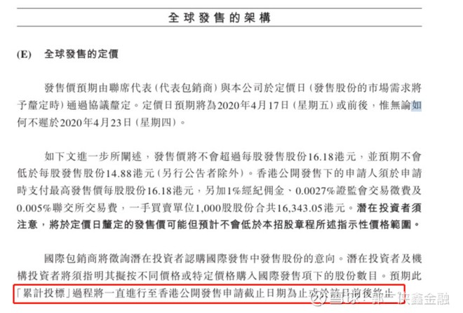 就是针对机构投资者采用累计投标方式进行询价,最终确定发行价格后,按照该价格同时向机构投资者(国际配售)和散户发售(公开认购),虽然最终发行价是由机构投资者累计投标决定,但是并非所有股票只针对询价的机构投资者发售,而是针对所有机构投资者和散户发售。