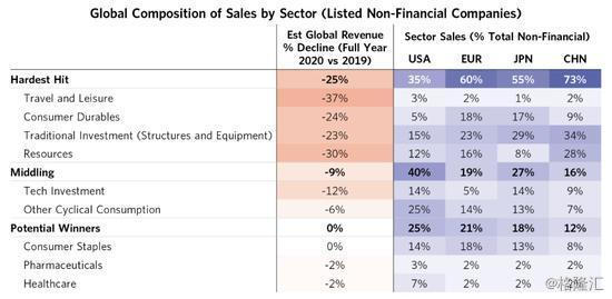 桥水对公司收入和GDP自下而上进行估算。受灾最严重的公司显然将是旅行和休闲(受到隔离疫情的直接影响),耐用消费品(主要是汽车,需求已经大幅下降和潜在的供应链中断),传统投资商品供应商(遭受大规模资本支出下降的可能发生)和资源。与其他经济体相比,美国收入对这些行业的敞口明显更小,而对受影响较小的行业(科技和其他周期性消费——主要是服务业)的敞口更大。