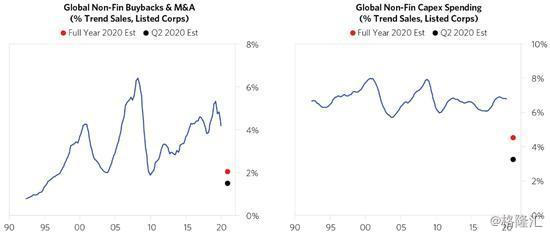 企业的支出通常与其收入和利润保持一致,因此,收入和利润下降将导致支出削减。目前已经看到许多公司宣布解雇工人,停止股票回购和分红,并推迟扩张计划。尽管第二季可能是今年企业支出最糟糕的时期,但下半年企业可能仍会极度保守。因此,很有可能在2020年看到资本支出和金融支出降至20多年来的最低水平。这对利润和股价的连锁影响将是巨大的。预计这种情况在美国将尤其严重,因为股价的上涨为美国的每股收益提供了极大的提振。
