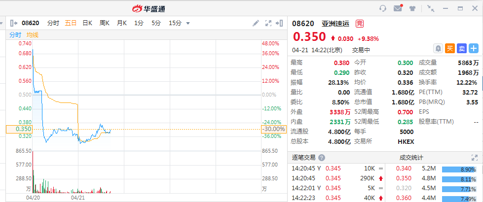 亚洲速运昨日在香港创业板上市,收盘大跌36%,全天振幅超80%,最高涨幅达40%,最大跌幅为43%。公司是一家香港空运货物地勤服务提供商,服务主要包括运输,空运货站营运,仓储及其他服务,每股定价为0.5港元,共集资净额1780万元。