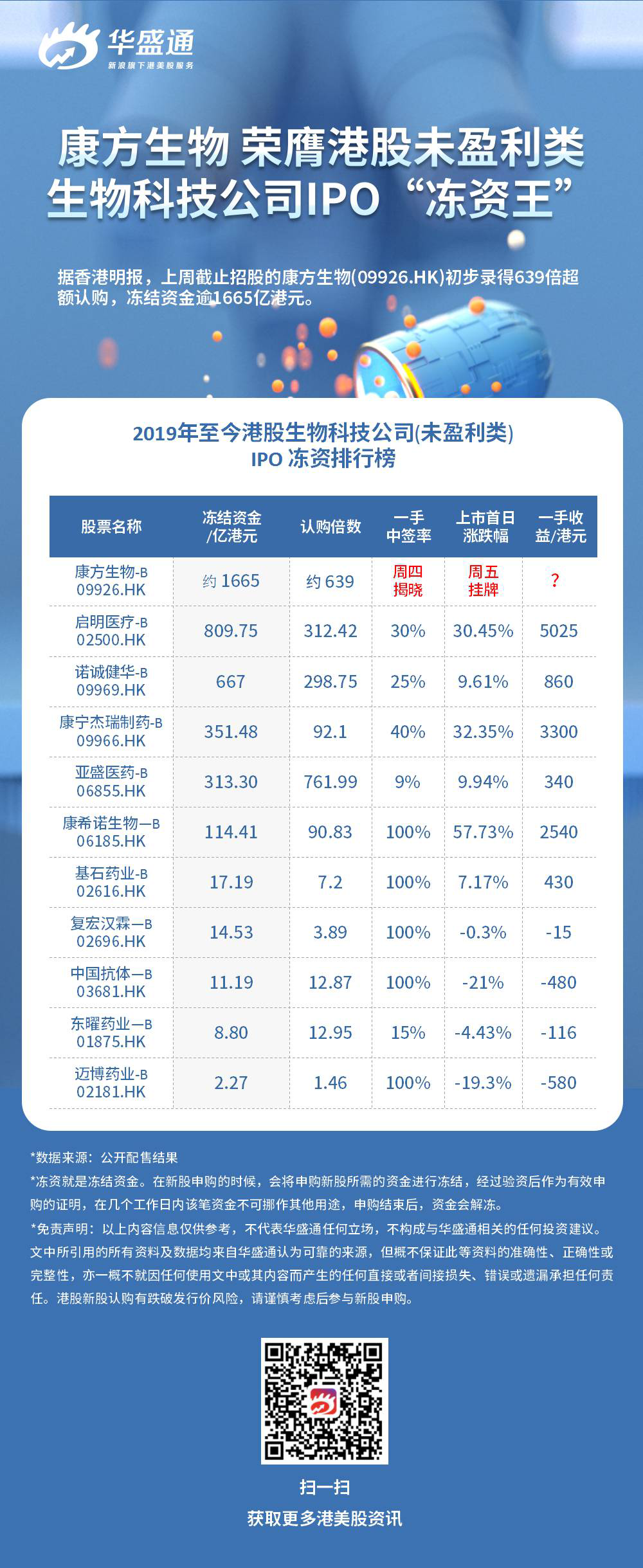 市场消息透露,生物医药技术公司康方生物(09926)于上周五中午截止公开发售,其初步已录得逾639倍超额认购,冻结资金逾1665亿元,有望成为2020年港股冻资王,且为港股按18A章上市的无收入生物科技公司中冻资金额最大的公司。