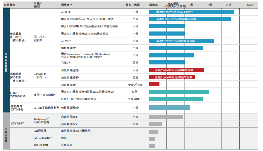 主要在研药物普克鲁胺(GT0918)是一款第二代(潜在三代)雄激素受体拮抗剂,正在中国进行针对转移性去势抵抗性前列腺癌(mCRPC)的III期临床试验,在美国进行针对mCRPC的II期临床试验以及针对乳腺癌的临床试验,并计划于2020年提交NDA。