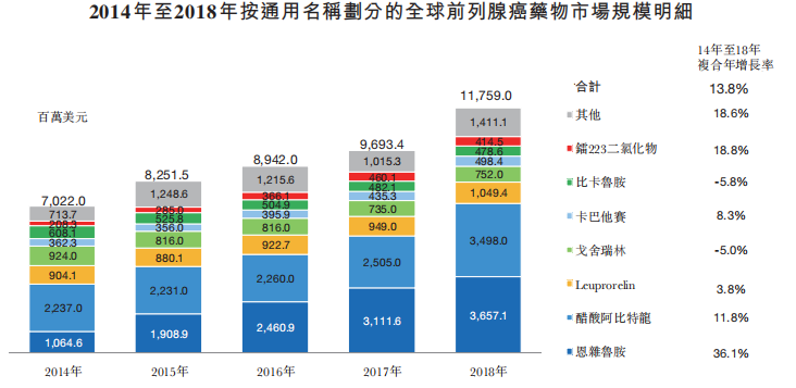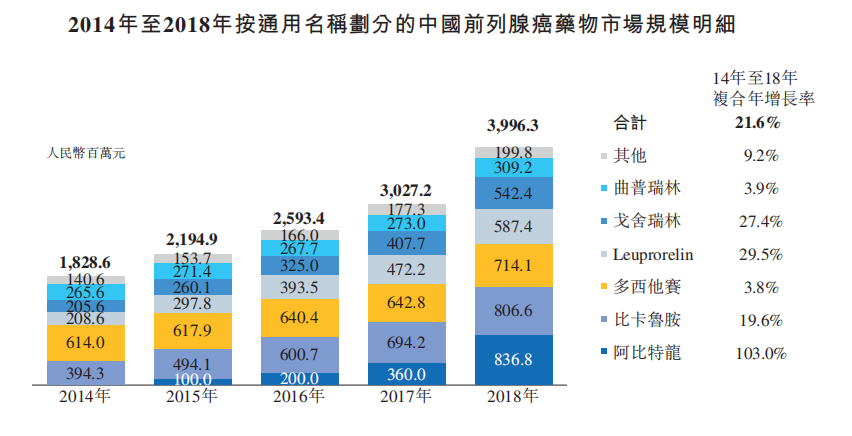 阿比特龙是2018年最大的仿制药分部,产生的收入为人民币8.36亿元,占中国前列腺癌药物市场总额的20.9%。自2015年获批准在中国使用以来,阿比特龙产生的收益占前列腺癌药物市场总收益的百分比显著增加。阿比特龙是一种雄激素生物合成抑制剂,其使用的增加源于中国前列腺癌患者的高治疗需求及由于药物的有效学术推广。 2017年,阿比特龙也被列入中国国家医保药品目录。