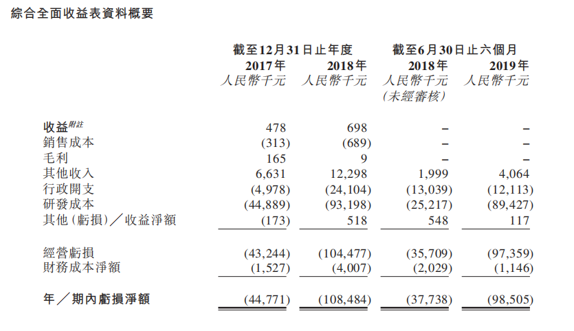 开拓药业是一家录得亏损且没有收入的生物医药公司。招股书显示,在过去的2017年、2018年和2019年上半年,开拓药业的营业收入分别为47.8万、69.8万和0万人民币,相应的净亏损分别为 4,477.1 万、10,848.4 万和 9,850.5 万人民币。