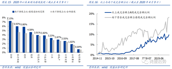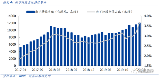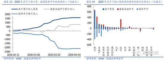 尤其在新冠疫情扩散以来,南下资金加速抢夺港股定价权。年初新冠疫情扩散以来,全球避险情绪显著抬升,尤其在3月份,中国大陆以外金融市场均表现出准危机模式,港股相较A股跌幅进一步加深。数据统计显示,自1月21日新冠疫情爆发至3月底,恒生指数相较沪指跌幅走阔10个百分点。从中介持股来看,港股在3月遭受了国际中介的大幅抛售,而港股通资金却在期间加速南下。其中,3月12日、3月13日和3月19日单日净流入均超过120亿,整个3月南下累计涌入1397亿。