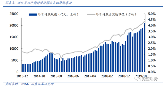 自2014年底两岸互联互通建立以来,A股国际化进程快速推进,带来的影响可谓极为深远。过去的5年,是国内资本市场对外开放全面提速的5年,也是A股真正走向国际化的5年。期间,我们先后见证了沪股通、深股通、MSCI、富时罗素纳入及扩容等里程碑式事件,也目睹了北上资金从无到有、逐步壮大的全过程。2016-19年,北上年累计净流入分别达到606亿、1997亿、2942亿、3517亿,至2019年底,外资持股市值占比(流通市值)已超过4%,日均成交占比接近10%。更重要的是,外资的流入给A股的定价体系和投资行为模式带来了极为深刻的影响,从历史发展的角度看,A股成熟化、价值化的帷幕大概率由此拉开。