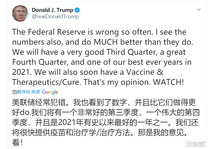 面对美股暴跌,美国总统特朗普发布推特表示:“美联储“经常犯错”;非农数据表现很好,我们将会有非常好的第三季度和第四季度,而2021年将是最好的一年;疫苗和治疗方法也将很快会出现,等着瞧吧!”
