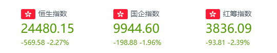 周四恒生指数开盘跌0.21%,早盘呈现窄幅震荡走势。受外围股指期货下跌影响,恒指午后加速下挫。截至收盘,恒生指数跌569.58点或2.27%,报24480.15点,全日成交额达1424.31亿。国企指数跌1.96%,报9944.6点,红筹指数跌2.39%,报3836.09点。