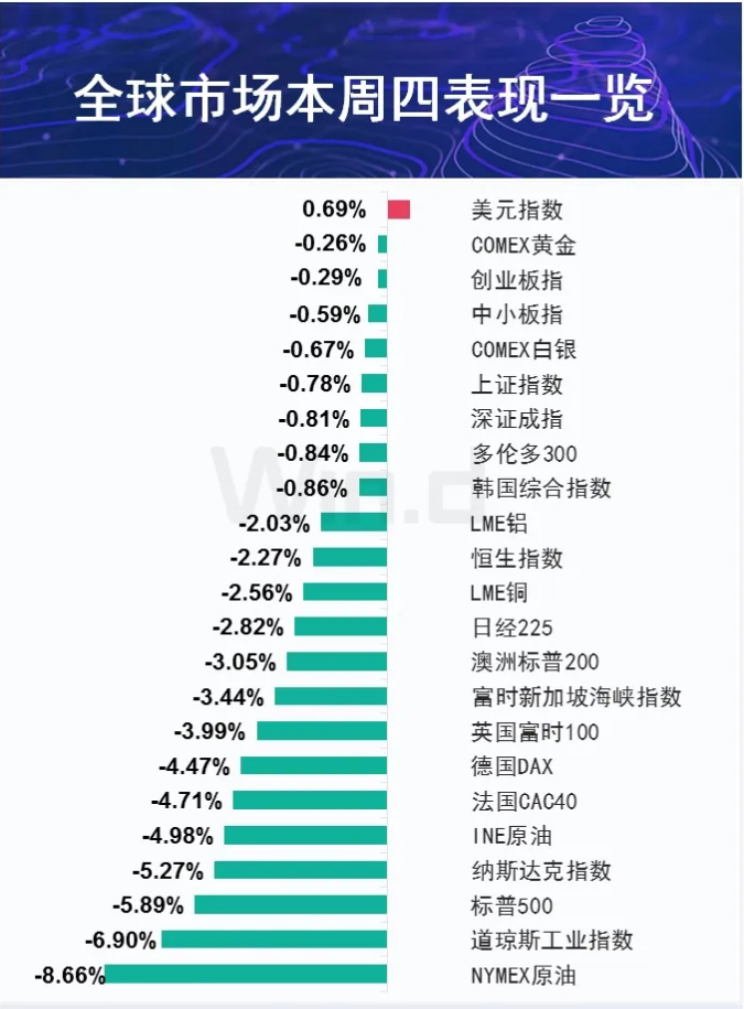 欧股方面,截至收盘,欧洲斯托克50指数跌4.53%,英国富时100指数跌3.99%,德国DAX30指数跌4.47%,法国CAC40指数跌4.71%。