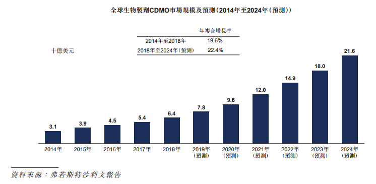 根据弗若斯特沙利文的资料,全球CDMO市场正以10.7%的年复合增长率快速增长,从2014年的178亿美金增至2018年的268亿美金。