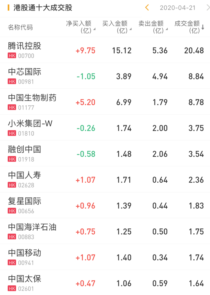 今日净买入腾讯控股9.75亿港元,净买入中国生物制药5.2亿港元,净买入中国人寿1.07亿港元,净买入复星国际0.96亿港元。