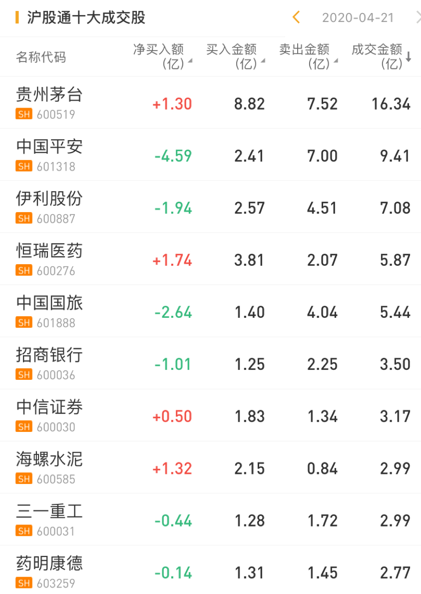 北上资金今日净流出10.26亿元,沪股通净买入贵州茅台1.3亿元,净买入恒瑞医药1.74亿元,净买入中信证券0.5亿元。