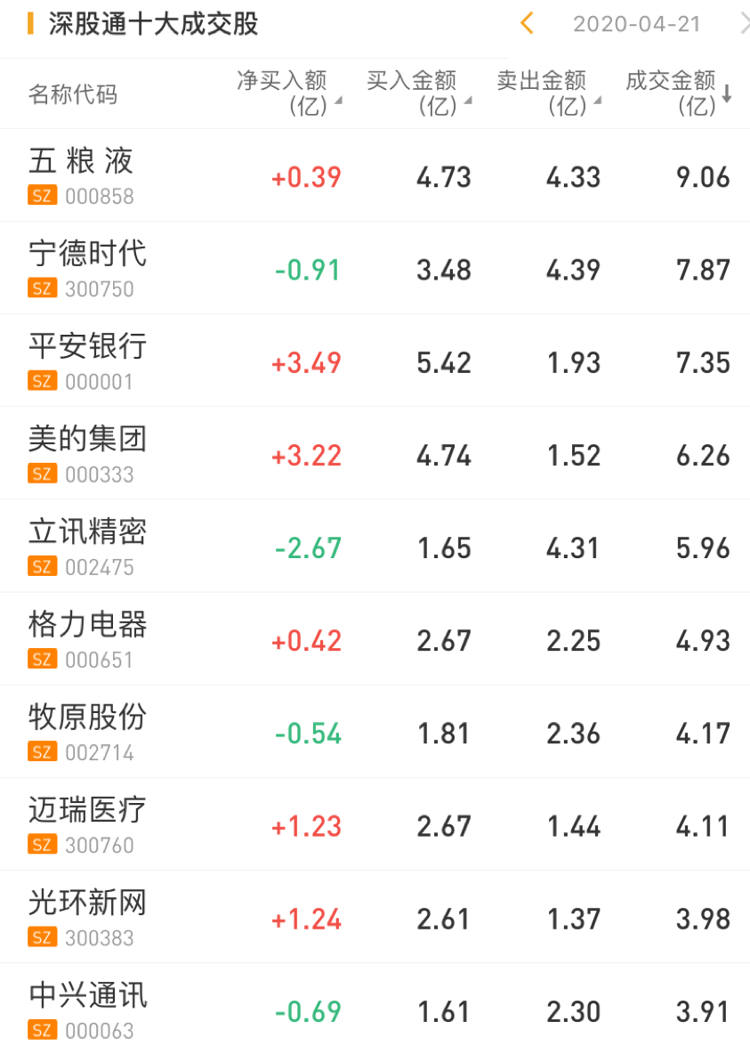 深股通净买入五粮液0.39亿元,净买入平安银行3.49亿元,净买入美的集团3.22亿元。
