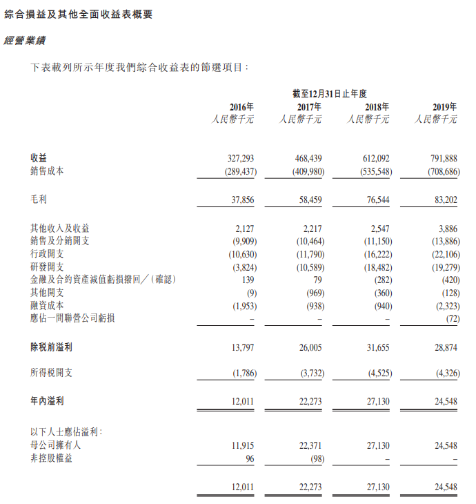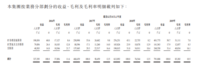 财务方面,2016-2019年,公司收益分别为3.27亿人民币(单位下同)、4.68亿、6.12亿以及7.92亿。母公司拥有人应占溢利分别为1191.5万、2237万、2713万以及2454.8万。期内,IT基础设施服务是公司的主要收入来源,分别占公司总收益的60.8%、53.6%、45.1%以及50.7%,但IT基础设施服务是公司业务中毛利率最低的业务。公司综合毛利率呈下滑态势,2018年为12.5%,2019年则下滑至10.5%。