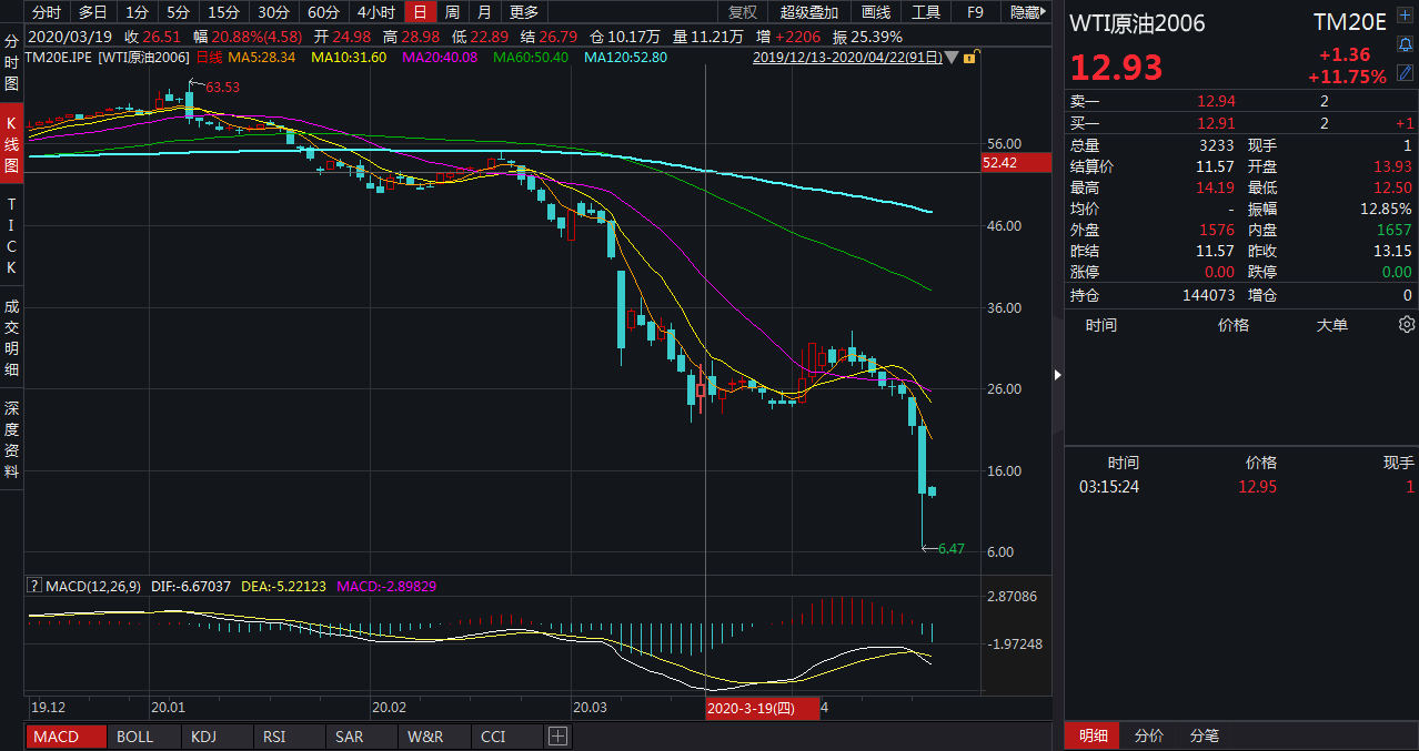 而在4月22日,原油期货价格跌至负数的第二天,恐慌性抛售情绪还蔓延到了6月份交割的合约。WTI6月的原油期货合约价格盘中一度暴跌近70%,跌破6.6美元创盘中历史新低。截止北京时间22日上午10点30分,WTI6月价格为12.93美元,仍为1999年2月以来的新低。