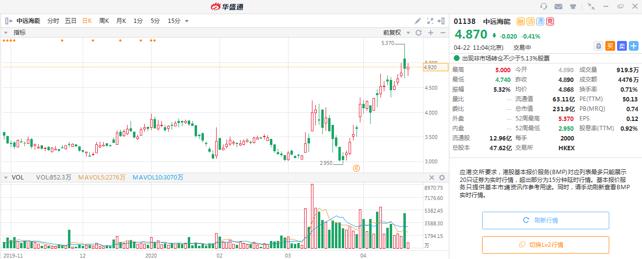 从布伦特原油期货价格走势来看,67.84美元的高位出现在2020年1月,而其后由于新冠肺炎对全球经济活动影响,叠加沙特与俄罗斯多次石油价格战争端,布伦特原油5月期货价格一直持续下跌至4月21日的19.05美元。而从3月24日至今,中远海能这家公司的股价从最低的2.95港元涨至最高的5.37港元,最大涨幅超过82%!