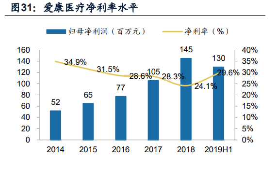 骨科植入物为高值医用耗材,除了市场增长迅速,爱康也维持较高的盈利能力。2014-2019年上半年,公司毛利率水平维持在68-71%,2019年上半年净利率高达29.6%。除2018年之外,公司ROE也都高于20%。