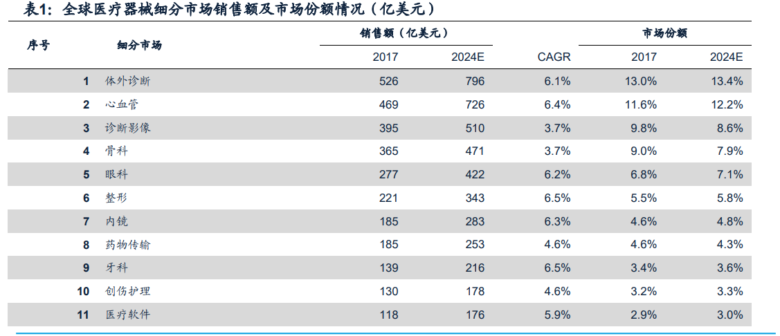 2017年,体外诊断(IVD)仍是全球医疗器械市场中市场规模排名第一的子领域,心血管、影像、骨科、眼科分别排名第二到第五。前五细分领域销售总额高达2032亿美元,占全球医疗器械市场的50%。2017年全球骨科市场规模为365亿美元,市场份额约9%,预计2024年骨科领域市场规模将达到471亿美元,2017-2024年复合增速约3.7%。
