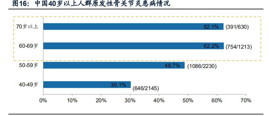 全国60岁以上的人口占比不 断提高,预计2021年将达到23%,净增约3000万人。根据《中华骨科杂志》发表的 一项调查,年龄在50-59岁、60岁及以上的老年人原发性骨关节炎的患病率分别为 48.7%和62.2%,显著高于40-49岁人群骨关节炎的发病率。