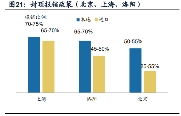 国产产品的医疗报销率高于进口产品。虽然报销率政策因城市而异,但国产骨科植入物的报销比例通常要高于进口骨科植入物。有部分地区,“新农合”对于关节植入物的报销仅覆盖国产品牌。具有技术产品质量和价格优势的领先国内企业将持续抢占进口企业的市场份额,成为这一趋势下的受益者。