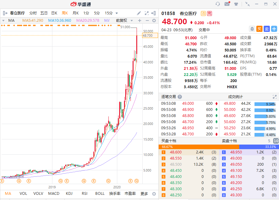 除了一年八倍的爱康医疗,还有一年前股价不到5元,近期最高点51港币的春立医疗,一年间春立医疗涨了十倍。