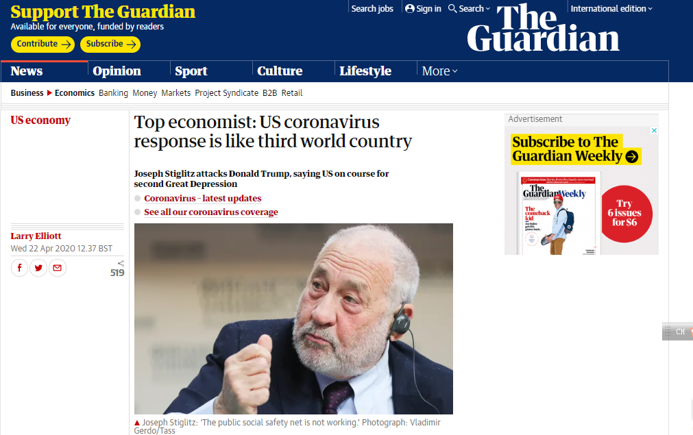 报道称,斯蒂格利茨批评特朗普的应对时表示,数百万人求助于食品银行(编者注:由慈善机构或其他组织管理,为购买食物有困难的人提供免费食物),由于没有病假工资而去工作以及因医疗不平等而死亡。