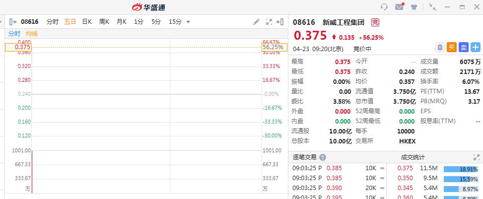 华盛资讯4月23日讯,新威工程集团开盘报价0.375港元,暴涨56.25%。