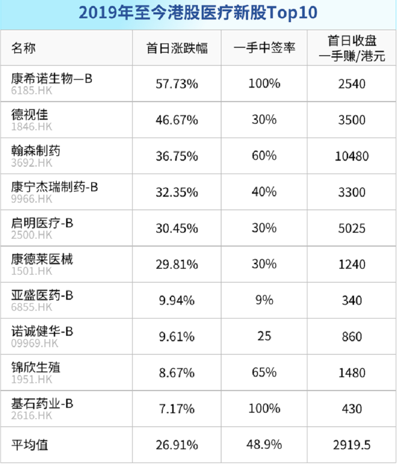 最后回味一下2019年至今港股生物科技类新股IPO的首日涨幅与收益,翰森制药首日大涨了60%,一手收益高达1W+。