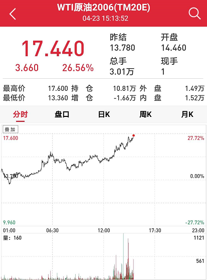 同时6月WTI原油合约涨幅扩大至26.56%,日内最高涨幅30%。