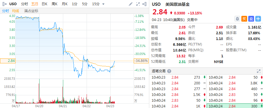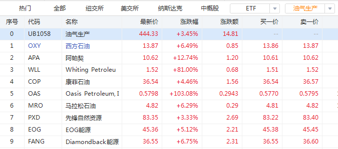 华盛资讯4月23日讯,美国原油基金涨幅扩大至13%,美股油气股普涨,西方石油现涨6.49%,康菲石油涨4.46%。