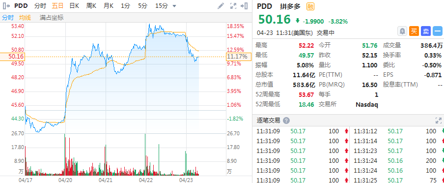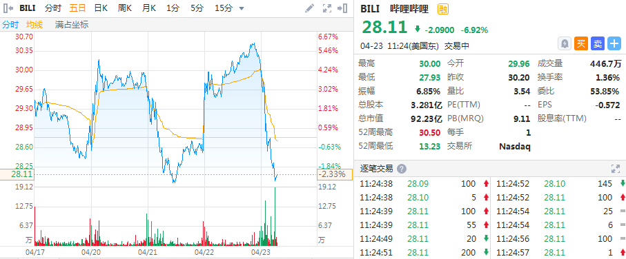 华盛资讯4月23日讯,哔哩哔哩刷新日低,截止发稿下跌6.92%,该股昨日刷新纪录高位。拼多多刷新日低,目前下跌3.89%,该股昨日也刷新收盘纪录高位。