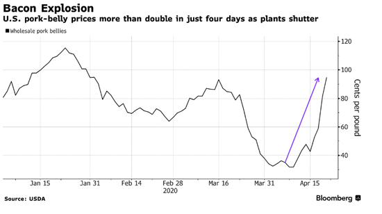 数据显示,肉类加工厂的关闭引发异常食品价格波动:五花肉价格3月份崩溃后,现如今在几天内翻了一番。