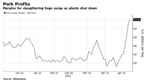 对于肉类包装厂来说,他们在以折扣价从农民那里获得生猪,然后转身向超市出售成品,以获得高额溢价。数据显示,自4月1日以来,猪肉利润率已增长340%。