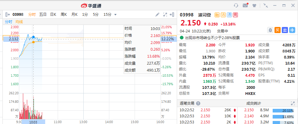 新浪港股讯 4月24日消息,波司登公布史上最大力度股份奖励计划,以0.97港币/股价格授予7名员工8700万股奖金股份,以1.94元/股行权价授予73名员工3.3亿股购股权,存续期达到51个月。公司股价今日大涨逾13%,报价2.15港元,市值净增22亿港元。