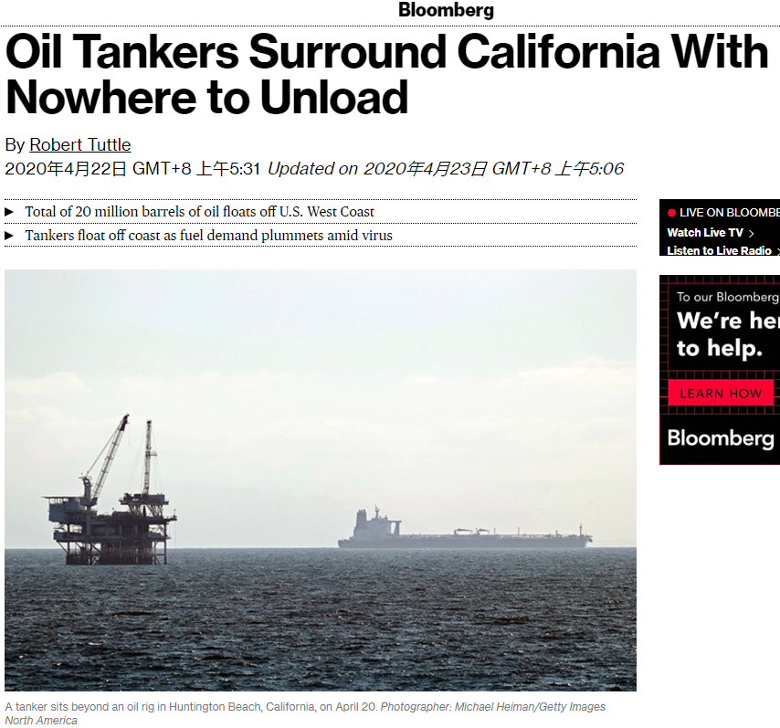4月22日,有外媒报道称,约30艘油轮载着2000万桶原油,在美国加州海岸漂浮,无处安放(Nowhere to Unload)。