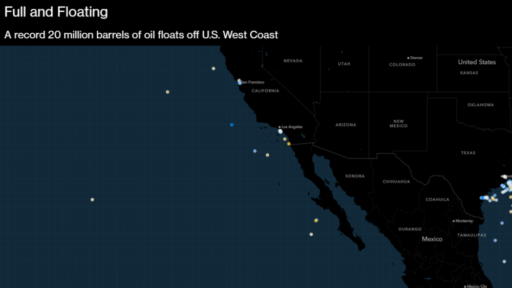 负责追踪油轮运输量的Kpler SAS公司表示,如此多原油漂浮在西海岸创下纪录,其中3/4的油轮正在储存原油,意味着它们漂浮在原处已有7日,这同样创下纪录。