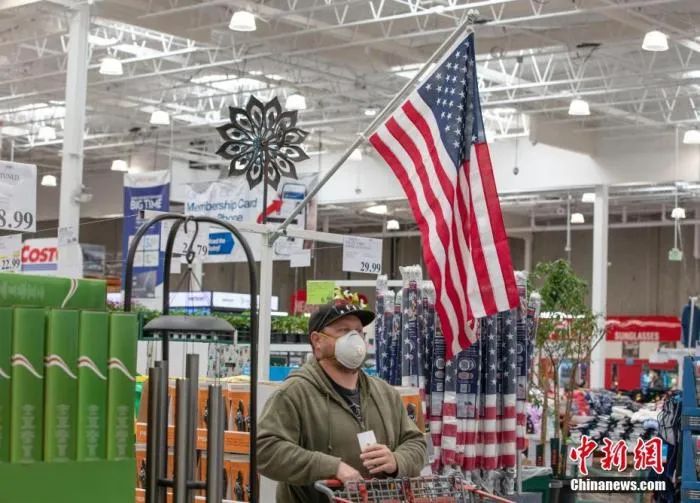 当地时间4月22日,位于美国旧金山湾区圣马特奥县的一家Costco超市内,顾客佩戴口罩购物。